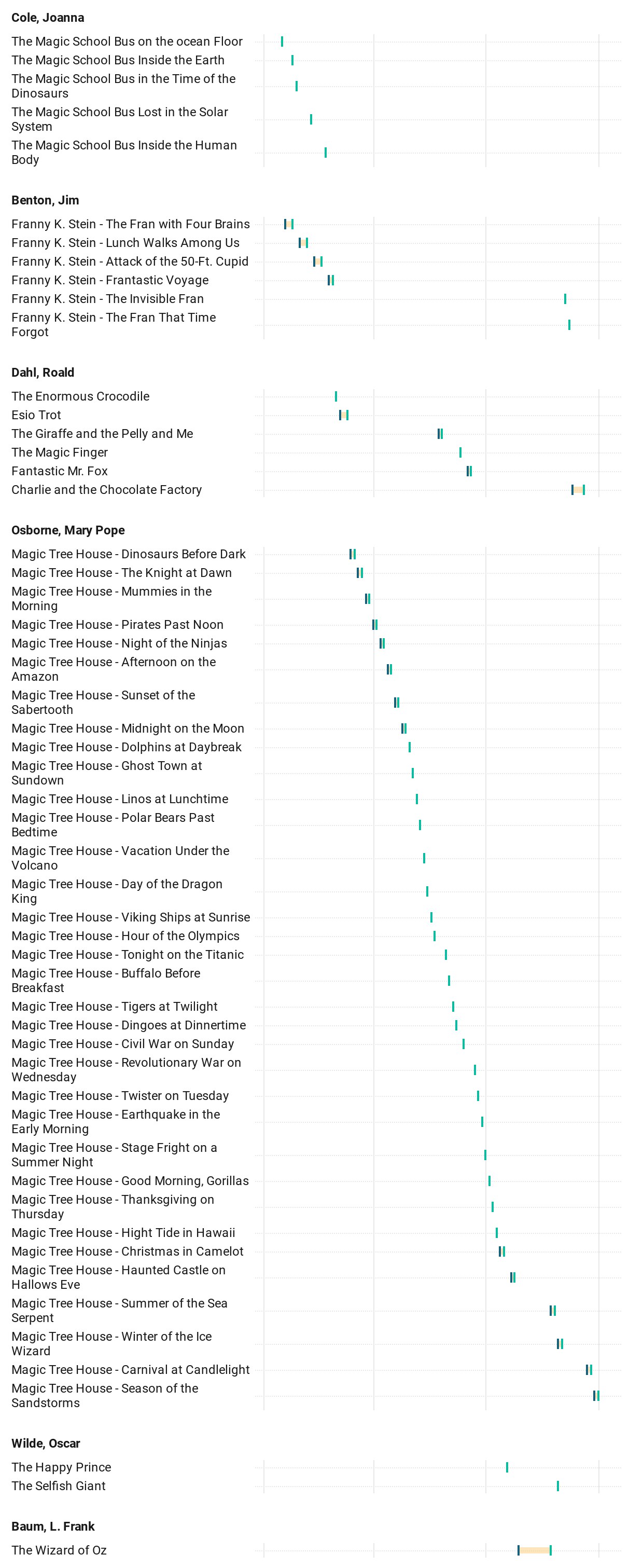 작가별로 묶어서 책 제목별로 읽는데 걸린 기간을 정리하면 아래와 같음